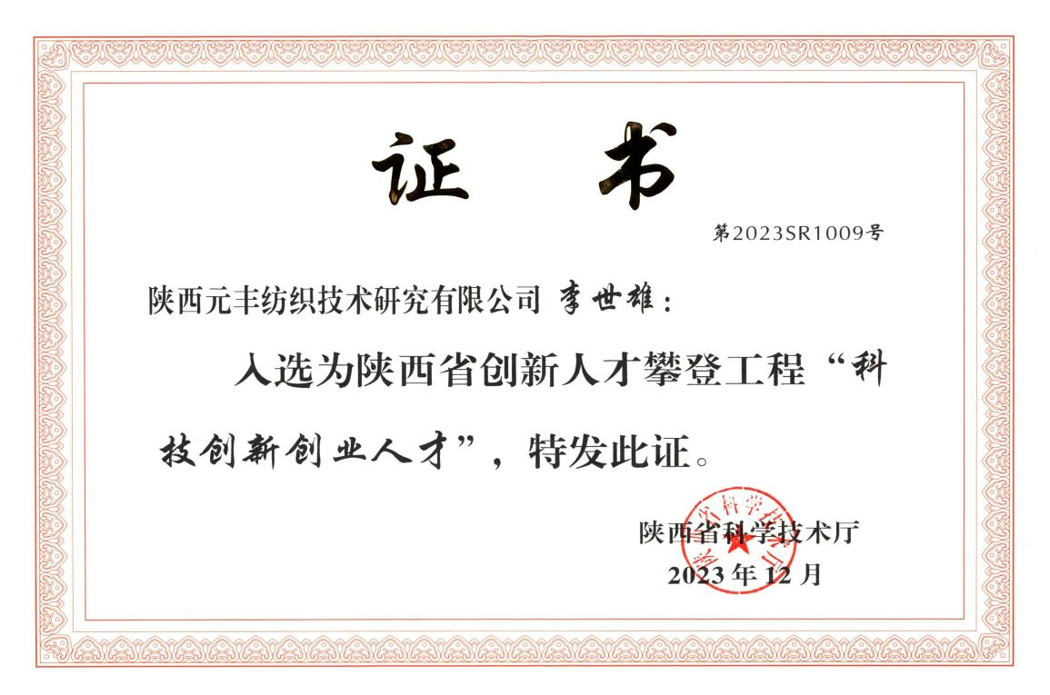 陕西元丰纺织技术研究有限公司李世雄 同志荣获“陕西省科技创新创业人才” 荣誉称号
